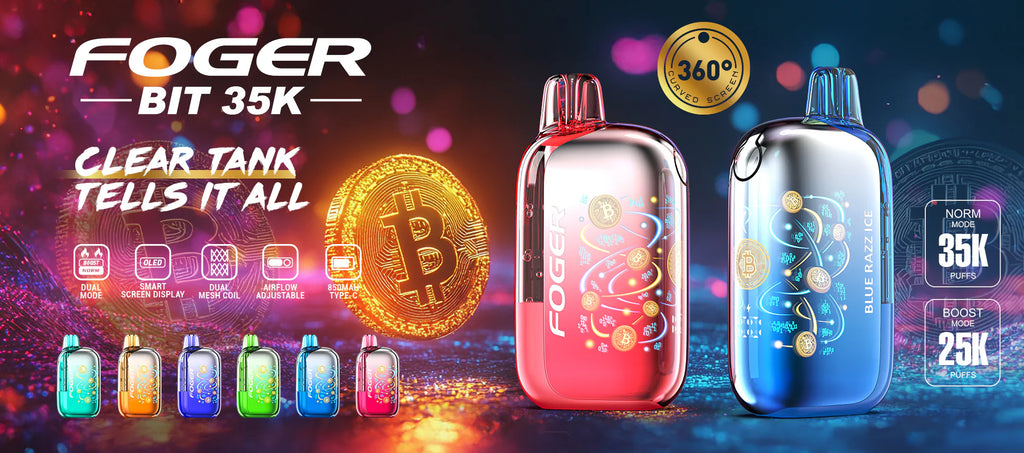 Discover the Foger Bit 35K Disposable, featuring a rechargeable 850mAh battery, up to 35,000 puffs, dual mesh coils, smart screen display, and bold digital bitcoin designs. A clear tank lets you see e-liquid levels, while the curved 3D OLED screen displays battery status and chip activity. Adjustable airflow enhances control, and a button lets you switch between two modes: Norm Mode, with the Bitcoin design hidden and up to 35,000 puffs, or Boost Mode, with the Bitcoin display active and up to 25,000 puffs. The device also supports rapid charging in 30 minutes with its USB Type-C port.
